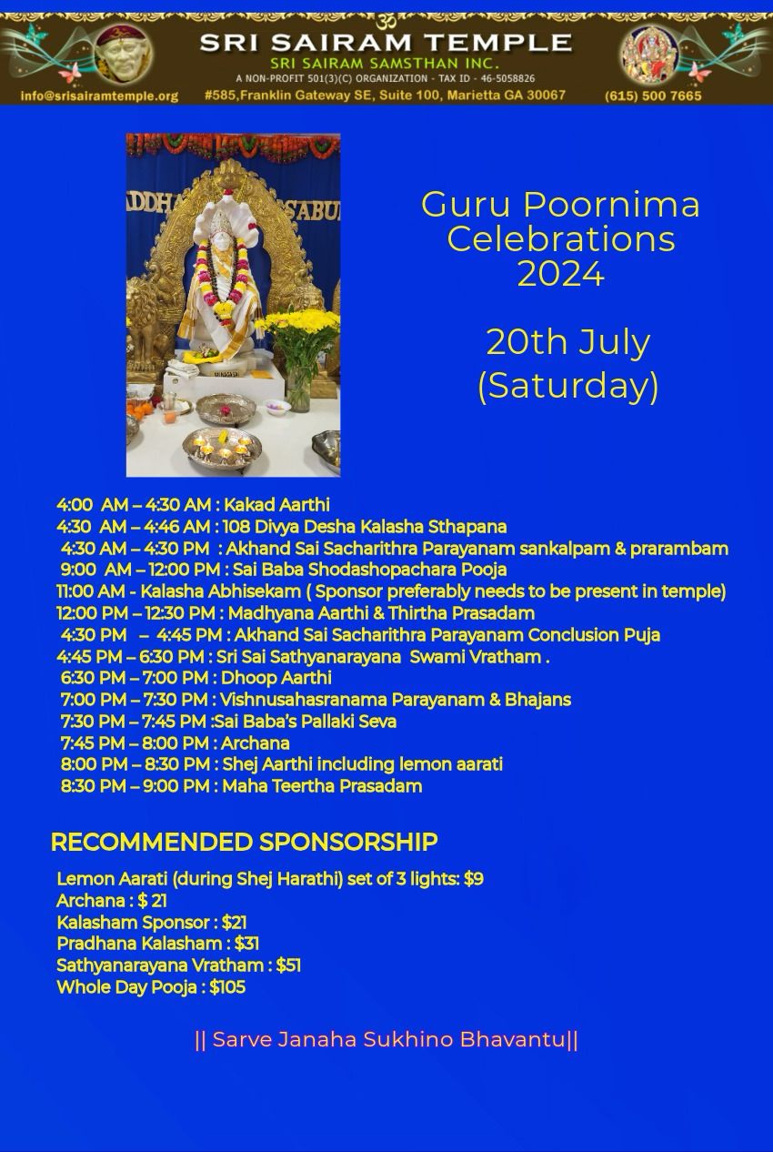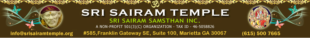 Suite 100, Marietta GA 30067. Email : info@srisairamtemple.org Phone: (615) 500 7665
